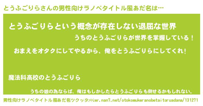 | 女子向けラノベタイトル風あだ名 | 『とうふごりら恋絵巻』 |