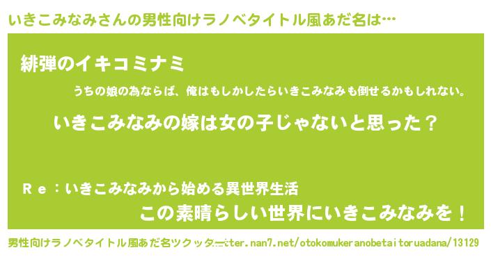 | 女子向けラノベタイトル風あだ名 | 『いきこみなみの卵を拾いまして』 |