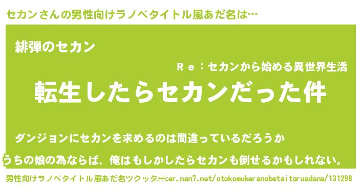 | 女子向けラノベタイトル風あだ名 | 『セカンの玉の輿計画!』『闇のセカン』 |
