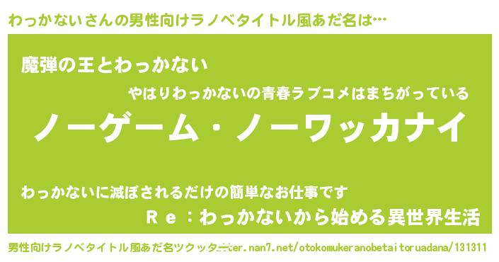 | 女子向けラノベタイトル風あだ名 | 『死神わっかないの再婚』 |