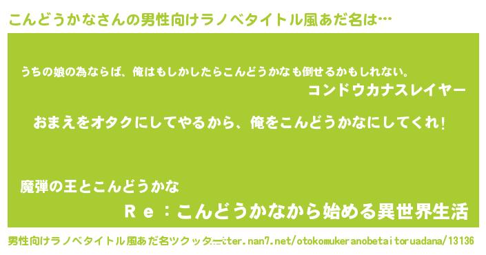 | 女子向けラノベタイトル風あだ名 | 『こんどうかな夫妻のなれそめ』 |