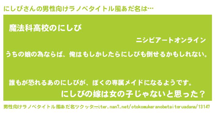 | 女子向けラノベタイトル風あだ名 | 『にしび伯爵の花嫁』『にしび様がみてる』 |