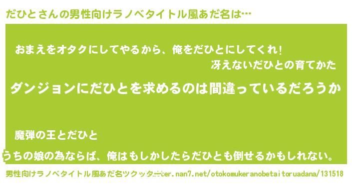 | 女子向けラノベタイトル風あだ名 | 『だひとの卵を拾いまして』 |