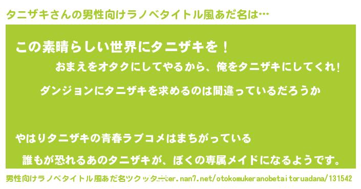 | 女子向けラノベタイトル風あだ名 | 『タニザキの卵を拾いまして』 |