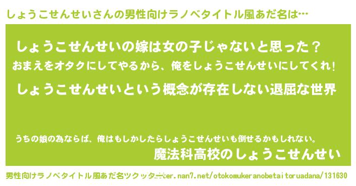 | 女子向けラノベタイトル風あだ名 | 『異世界で失敗しない100のしょうこせんせい』 |