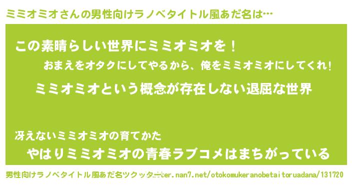 | 胡散臭い通販商品みたいなあだ名 | 『絶対に幸福をもたらす水素水…その名も「ミミオミオ」』 |