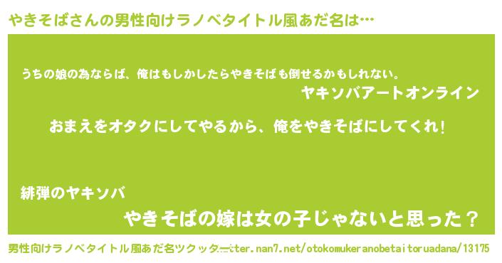 | 女子向けラノベタイトル風あだ名 | 『やきそば夫妻のなれそめ』 |