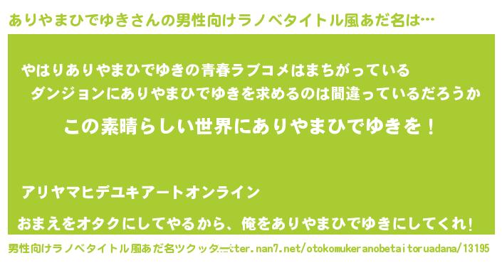 | 女子向けラノベタイトル風あだ名 | 『悪役ありやまひでゆきに転生したようですが、知った事ではありません』 |