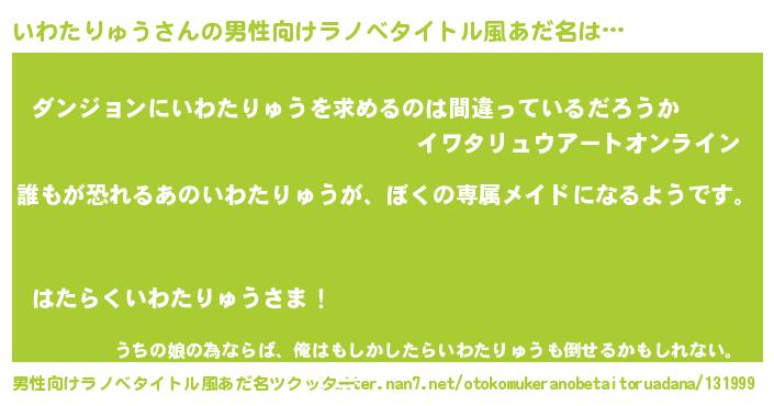 | 女子向けラノベタイトル風あだ名 | 『異世界でカフェいわたりゅうを開店しました。』 |