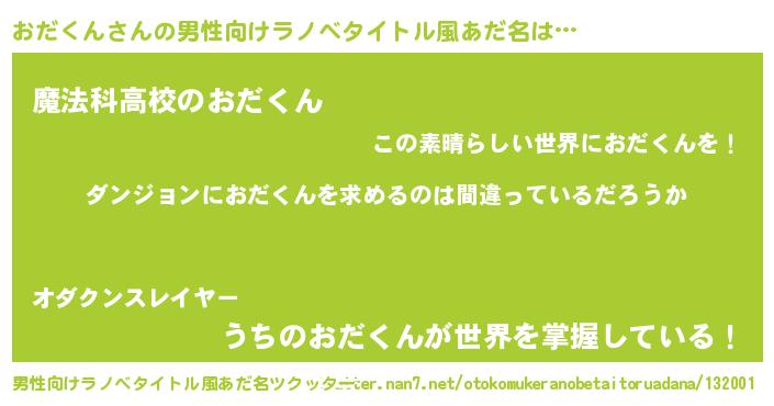 | 女子向けラノベタイトル風あだ名 | 『おだくんの卵を拾いまして』 |