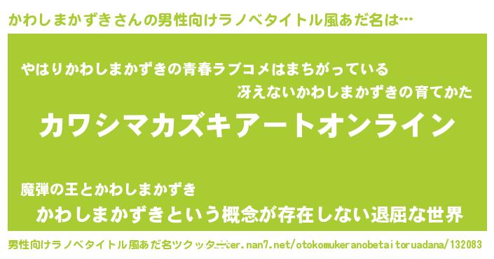| 女子向けラノベタイトル風あだ名 | 『誰かこのかわしまかずきを説明してください! ~契約から始まるウェディング~』 |