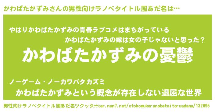 | 女子向けラノベタイトル風あだ名 | 『(仮)かわばたかずみのやんごとなき事情』 |