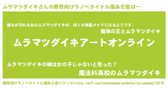| 女子向けラノベタイトル風あだ名 | 『誰かこのムラマツダイキを説明してください! ~契約から始まるウェディング~』 |