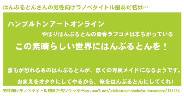 | 意味不明あだ名 | 『住所不定無職はんぶるとん(8歳)』 |