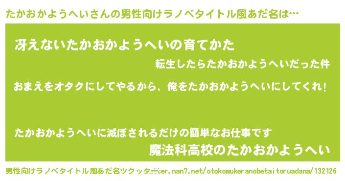 | 女子向けラノベタイトル風あだ名 | 『たかおかようへい夫妻のなれそめ』 |