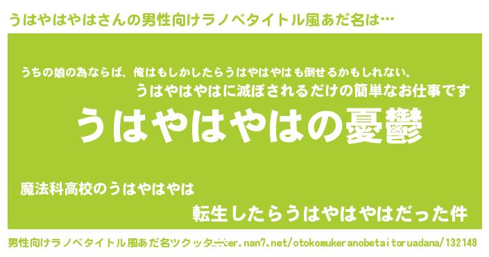 | 女子向けラノベタイトル風あだ名 | 『(仮)うはやはやはのやんごとなき事情』 |