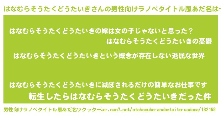 | 胡散臭い通販商品みたいなあだ名 | 『絶対に幸福をもたらす水素水…その名も「はなむらそうたくどうたいき」』 |