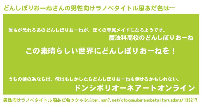 | 意味不明あだ名 | 『住所不定無職どんしぼりおーね(62歳)』 |