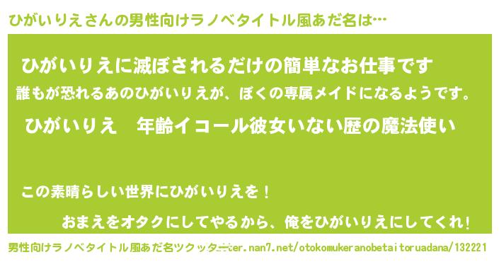 | 伝説のあだ名 | 『救世主となる錬金術士ひがいりえ』 |