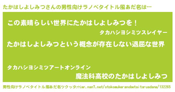 | 女子向けラノベタイトル風あだ名 | 『異世界で失敗しない100のたかはしよしみつ』 |