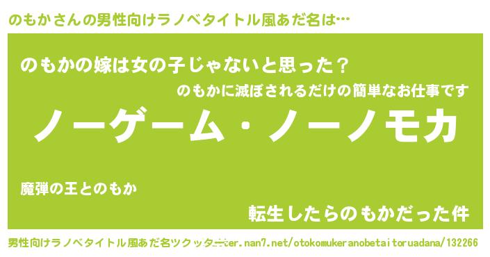 | 女子向けラノベタイトル風あだ名 | 『死神のもかの再婚』『のもか様がみてる』 |