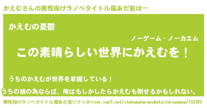 | 胡散臭い通販商品みたいなあだ名 | 『世界中を虜にした世界で10本だけ現存している希少なブランデー…その名も「かえむ」』 |