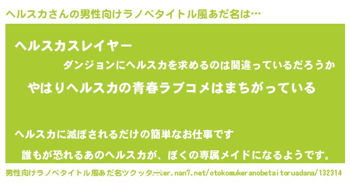 女子向けラノベタイトル風あだ名 | 『ヘルスカの雑貨屋さん』 |