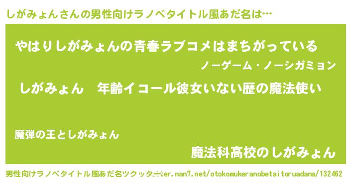 | 女子向けラノベタイトル風あだ名 | 『しがみょんの玉の輿計画!』 |