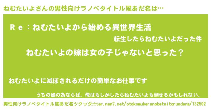 | 女子向けラノベタイトル風あだ名 | 『ねむたいよの卵を拾いまして』 |
