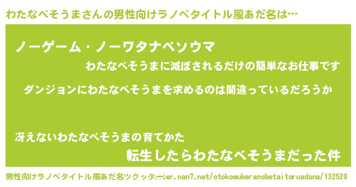 | 胡散臭い通販商品みたいなあだ名 | 『伝統あるサプリメント…その名も「わたなべそうま」』 |