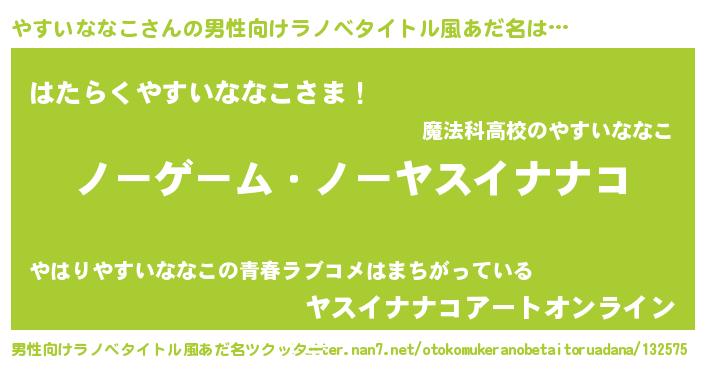 | 女子向けラノベタイトル風あだ名 | 『死神やすいななこの再婚』 |