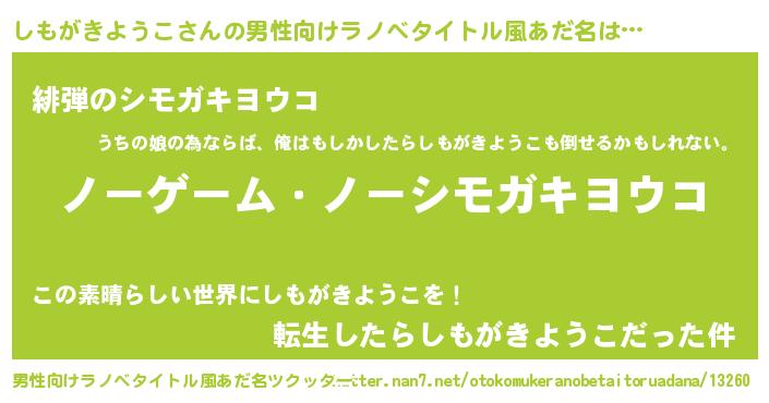 | 女子向けラノベタイトル風あだ名 | 『しもがきようこ恋絵巻』 |