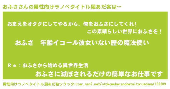 | 女子向けラノベタイトル風あだ名 | 『おふさの玉の輿計画!』 |