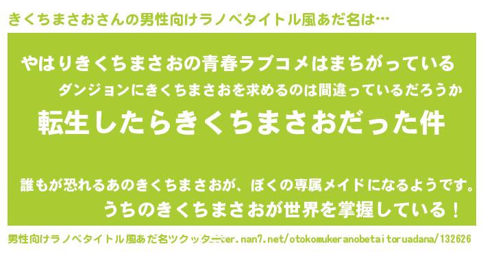 | 女子向けラノベタイトル風あだ名 | 『婚約破棄系悪役きくちまさおに転生したので、保身に走りました。』 |