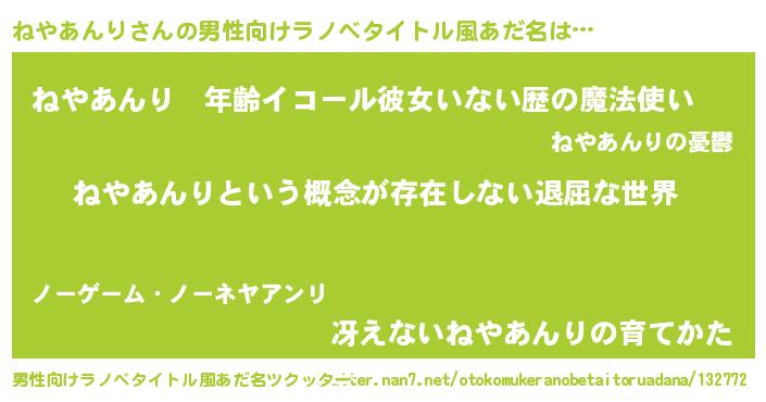 | 女子向けラノベタイトル風あだ名 | 『異世界で失敗しない100のねやあんり』 |