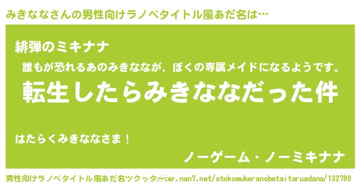 | 女子向けラノベタイトル風あだ名 | 『みきななの玉の輿計画!』 |