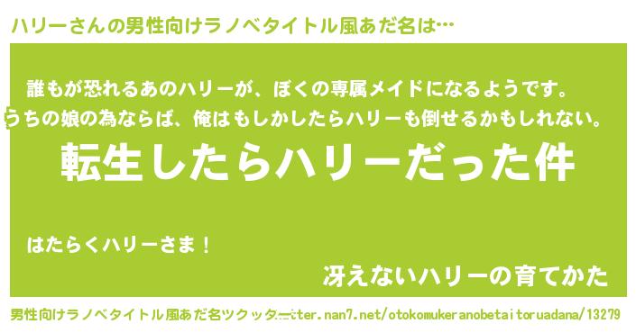 | 胡散臭い通販商品みたいなあだ名 | 『来世でも幸せになれる水素水…その名も「ハリー」』 |