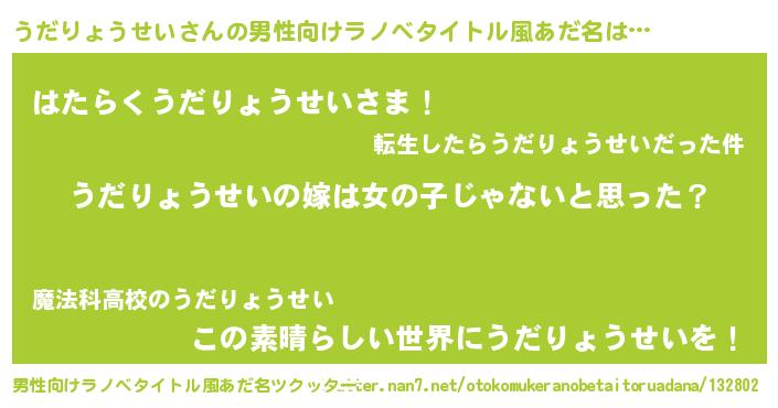 | 女子向けラノベタイトル風あだ名 | 『うだりょうせいの卵を拾いまして』 |