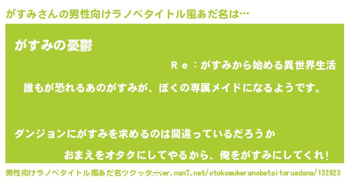 | 女子向けラノベタイトル風あだ名 | 『がすみの契約王妃』『がすみ恋絵巻』 |