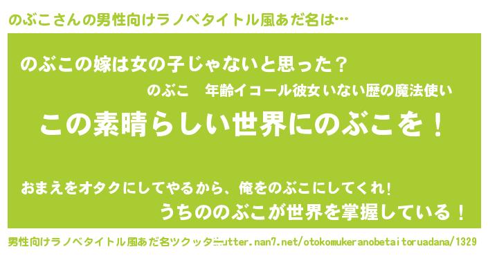| 女子向けラノベタイトル風あだ名 | 『悪役のぶこに転生したようですが、知った事ではありません』 |