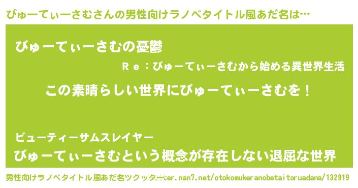 | 意味不明あだ名 | 『住所不定無職びゅーてぃーさむ(4歳)』 |