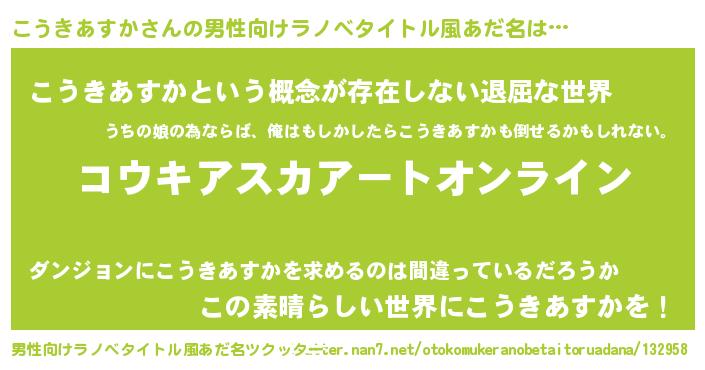 こうきあすかさんの男性向けラノベタイトル風あだ名をツクッター!