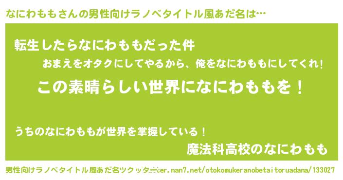 | 女子向けラノベタイトル風あだ名 | 『乙女ゲームの破滅フラグしかない悪役なにわももに転生してしまった…』 |