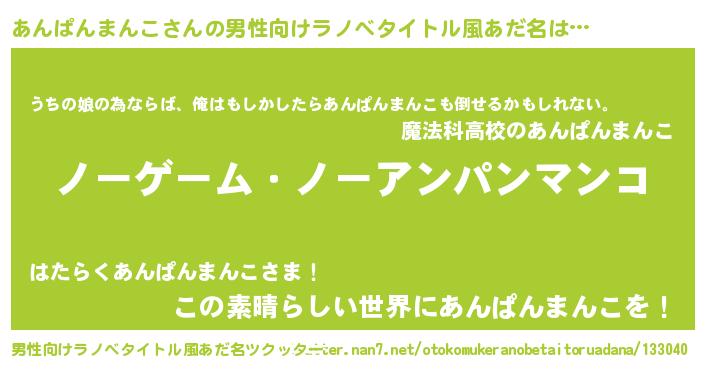 | 女子向けラノベタイトル風あだ名 | 『死神あんぱんまんこの再婚』 |