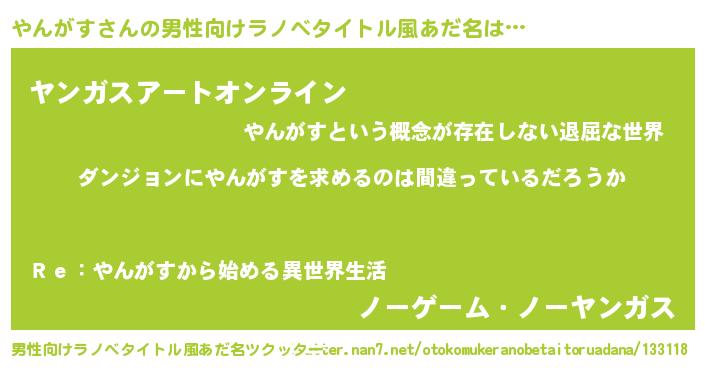 | 女子向けラノベタイトル風あだ名 | 『やんがすは平凡を望む』『闇のやんがす』 |
