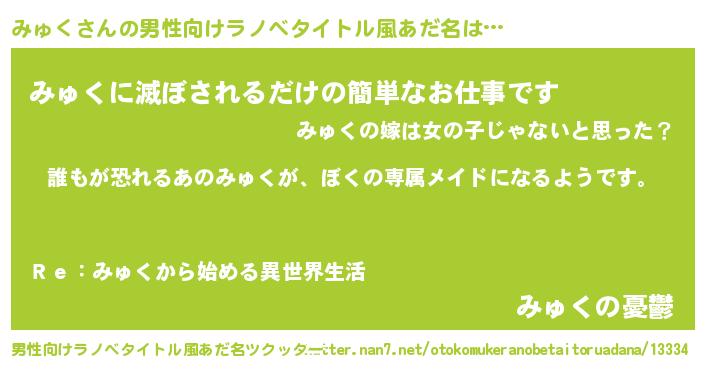 | 胡散臭い通販商品みたいなあだ名 | 『来世でも幸せになれる水素水…その名も「みゅく」』 |