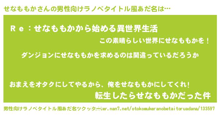 | 女子向けラノベタイトル風あだ名 | 『せなももかの卵を拾いまして』 |