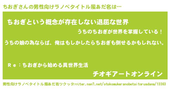 | 女子向けラノベタイトル風あだ名 | 『ちおぎ伯爵の花嫁』『ちおぎの契約王妃』 |