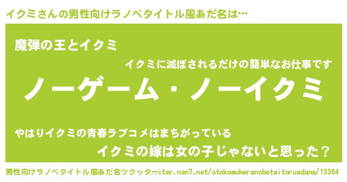 | 女子向けラノベタイトル風あだ名 | 『死神イクミの再婚』『イクミ様がみてる』 |