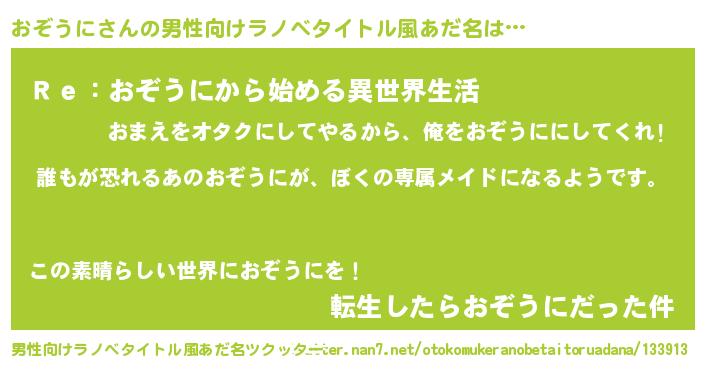 | 女子向けラノベタイトル風あだ名 | 『異世界でカフェおぞうにを開店しました。』 |